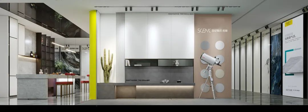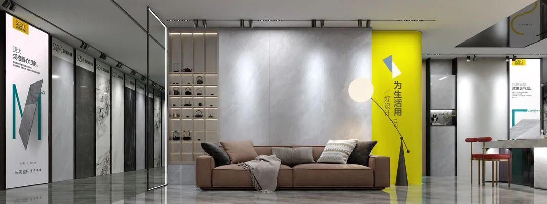 雅灰立定空間調性,檸檬 黃為雅灰注入鮮亮澄澈,展示出森尼陶瓷·巖板的時尚和活力。