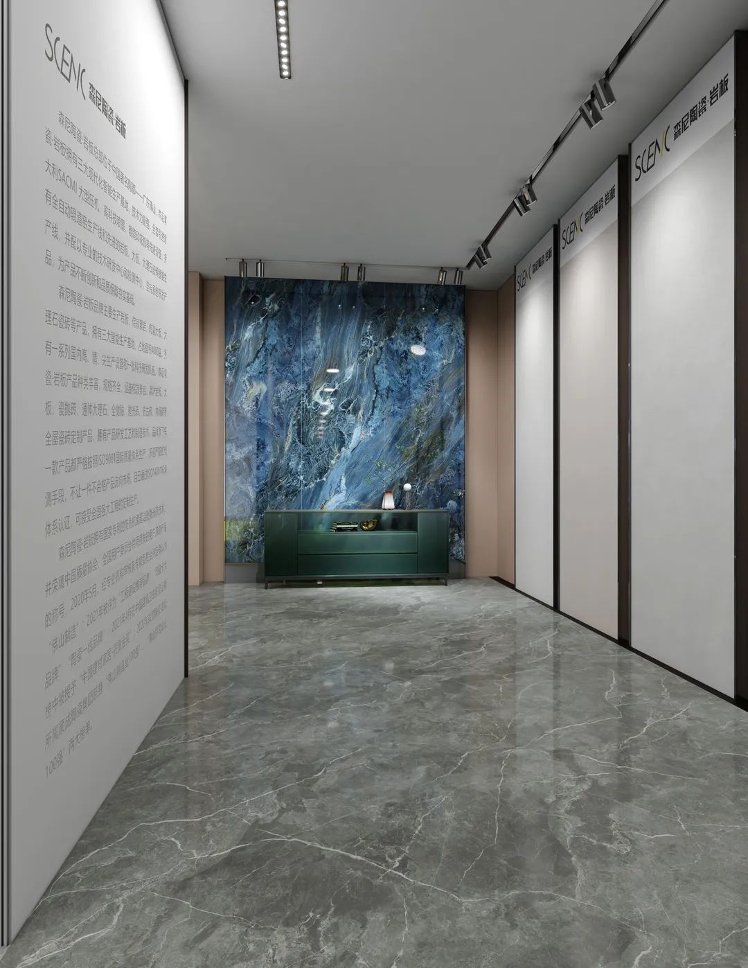 巖板定制電視墻區,無一不是精品。大地色系搭配水墨山水風格墻板,讓空間降調,旁邊巖板選材林立,方便客戶隨時比對選購。