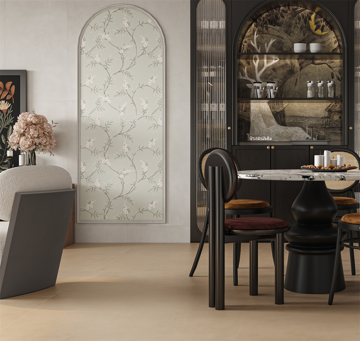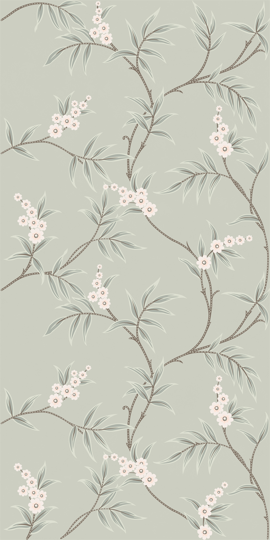 淺灰枝影于米白底上蜿蜒伸展,綴以淡粉小花,以留白筆法勾勒出東方靜謐意境。