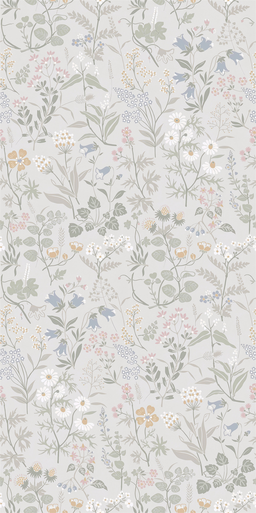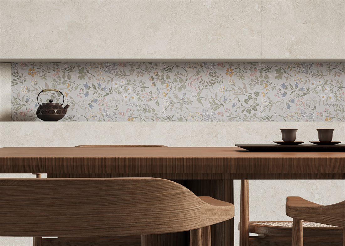 手繪百花錯(cuò)落鋪展,色調(diào)柔和如古典詞集,賦予墻面滿幅書香與自然生趣。